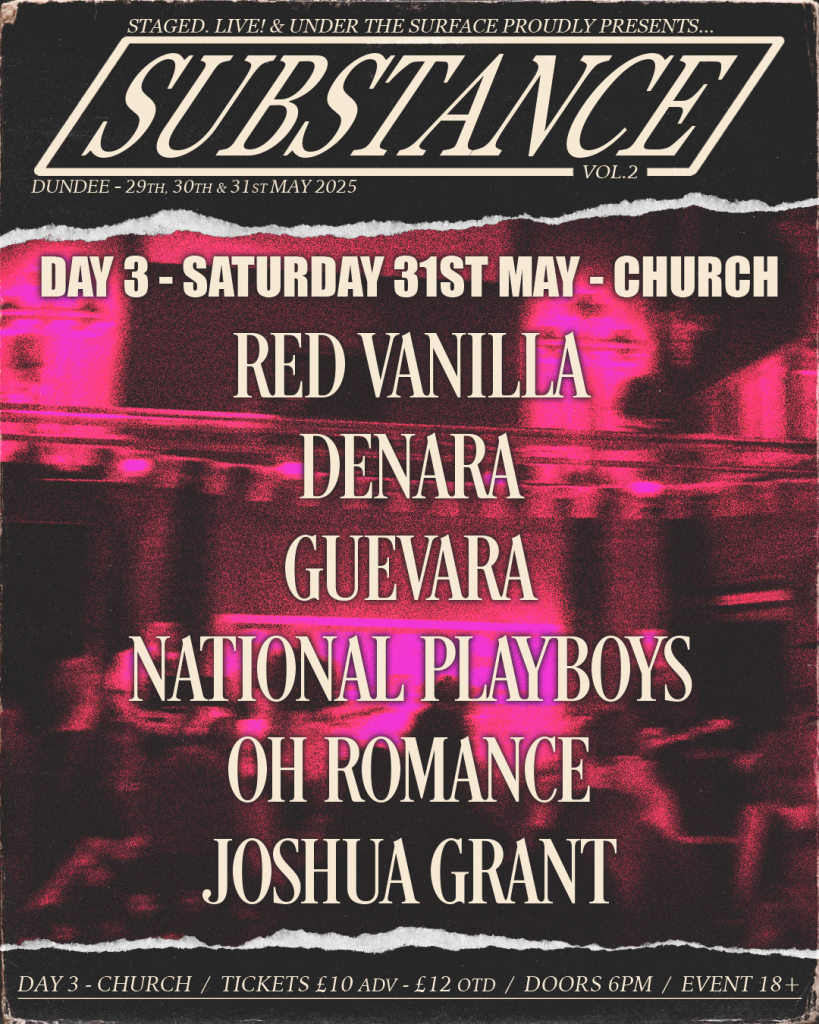 For Oh Romance and National Playboys this is actually just one stop for both of the bands as part of their current UK tours, so it’s definitely quite exciting to be getting artists on the lineup that are going from playing a place like London one day to then coming up to Dundee to play Substance the next aha